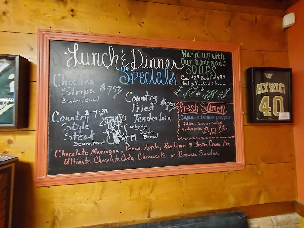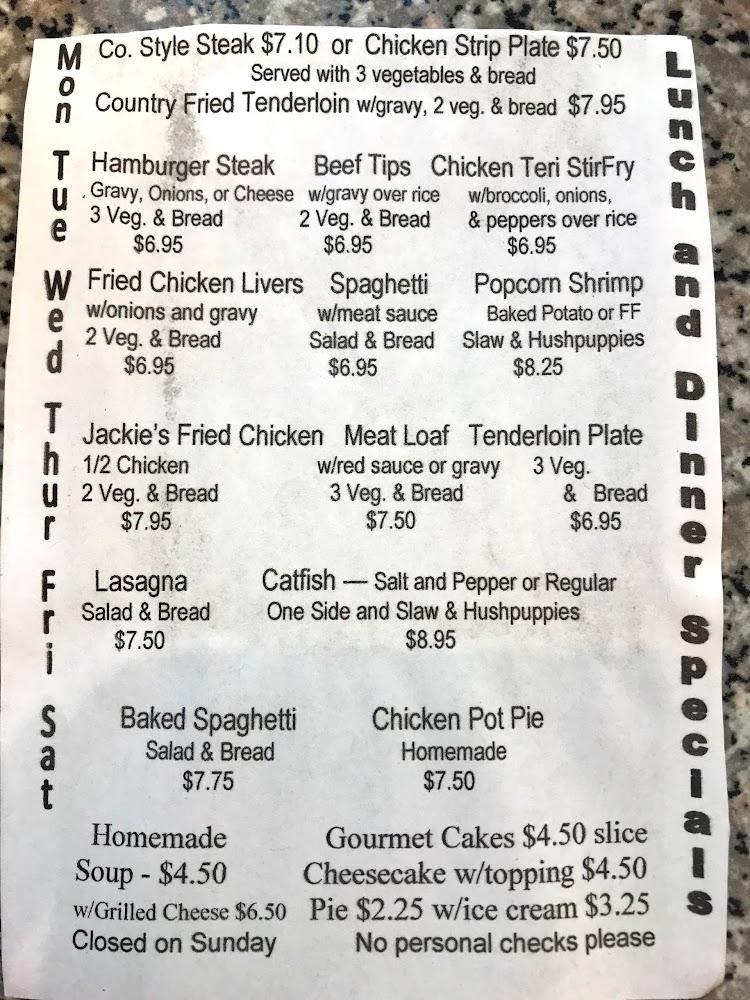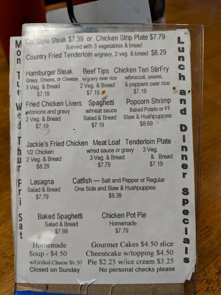For lunch and dinner, the offerings include satisfying comfort dishes such as chicken pot pie, baked spaghetti, and country-fried steak. Each plate showcases home-cooked flavors with generous portions. Desserts, including homemade pies and cheesecakes, offer a sweet finish to the meal.