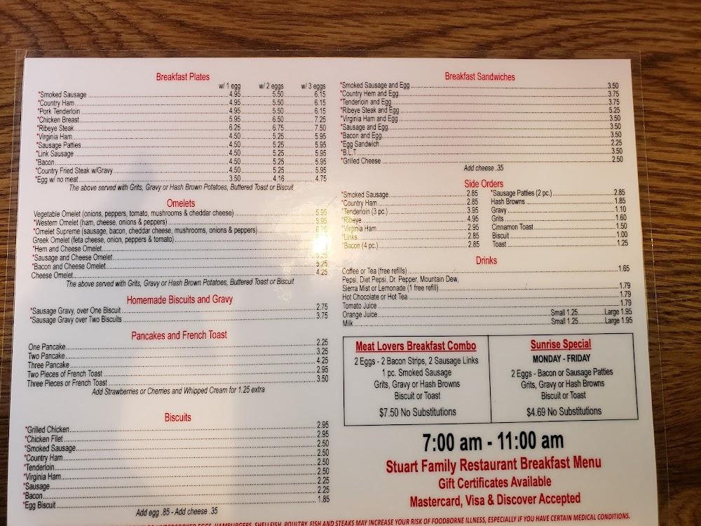 Welcome to Stuart Family Restaurant, your go-to spot in Stuart, VA for a delicious and wholesome dining experience. Located at 307 S Main St, we offer a warm and relaxed atmosphere perfect for families and friends. Enjoy our extensive menu featuring breakfast served all day, delightful lunch options, and mouthwatering desserts. With an excellent selection of coffee and teas, there’s something for everyone, including vegetarian choices. Our services include drive-thru, takeout, and delivery, and we proudly provide wheelchair accessibility. Join us for a delightful meal where local specialties meet a family-friendly environment!